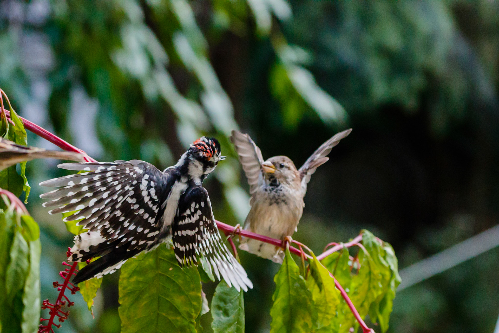 Woodpecker sparrows fight
